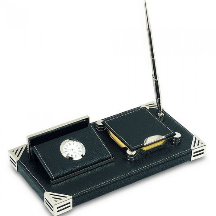 Περιγραφή: Δερμάτινο Σετ γραφείου με μολυβοθήκη, στυλό, ρολόι και χαρτιά σημειώσεων